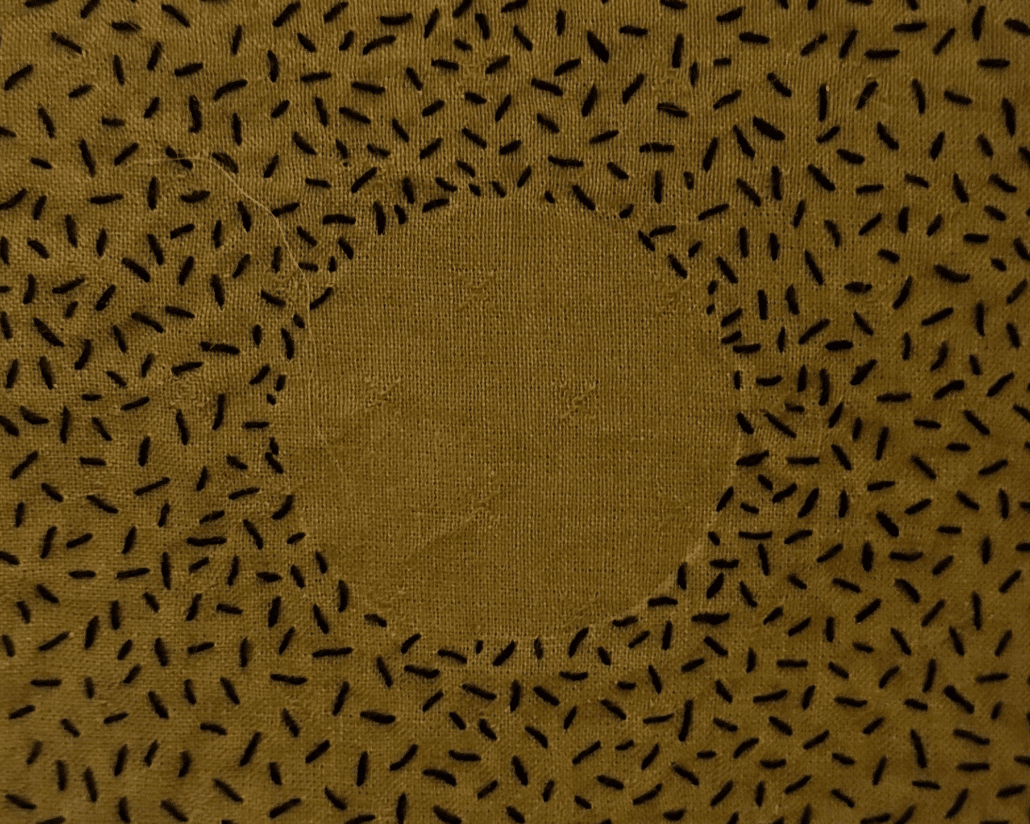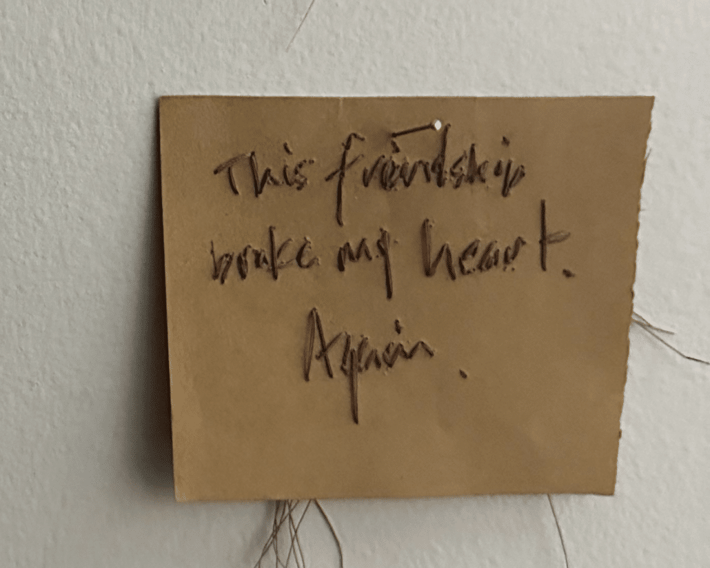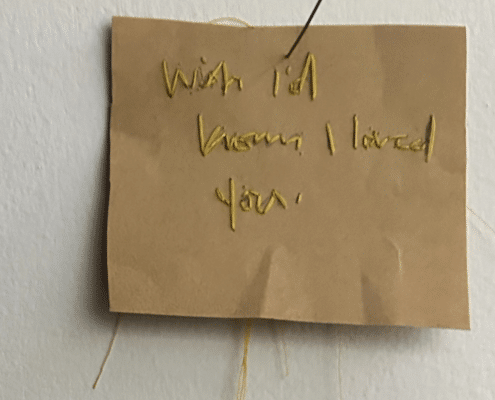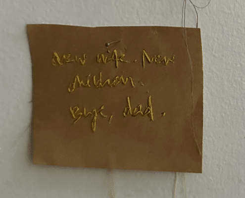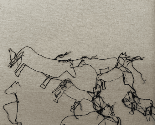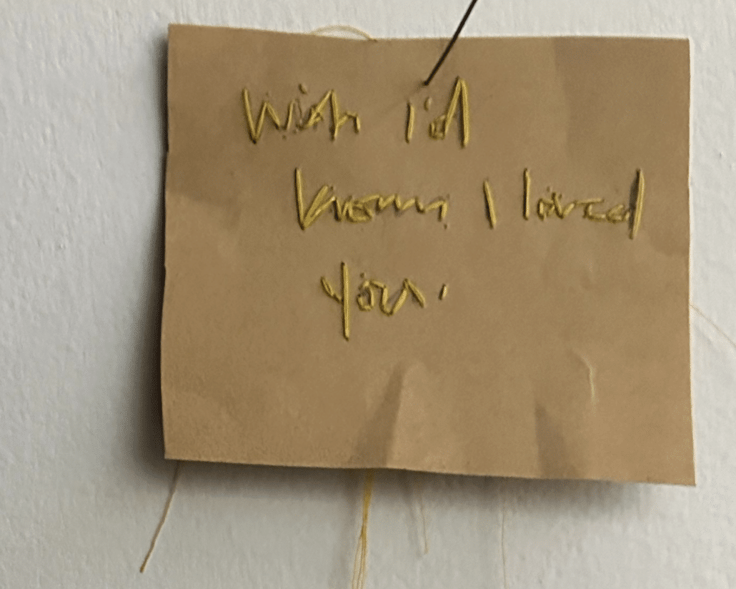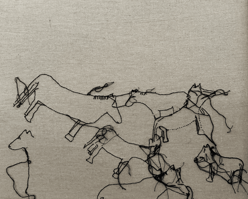 When I slowly started dipping my toes back into it, I approached with a very particular intention to work in a way that was not only not commodification-minded, but actually rejected the capitalistic framework altogether. In other words, using materials without an end ‘product’ in mind, avoiding creating marketable ‘series’ of things, and using craft skills that have traditionally been used to create functional objects or add value through decoration, to create art objects that are both useless and lacking in purpose and intention. This intention manifested in the following exercises: raggedly stitching sentences I’d pulled from old diaries into found scraps of paper with old thread; stitching the likeness of a childhood horse drawing over and over, overlapping and in nonsensical patterns, from memory; sewing leftover fabric pieces together using embroidery thread, with no end goal in mind.